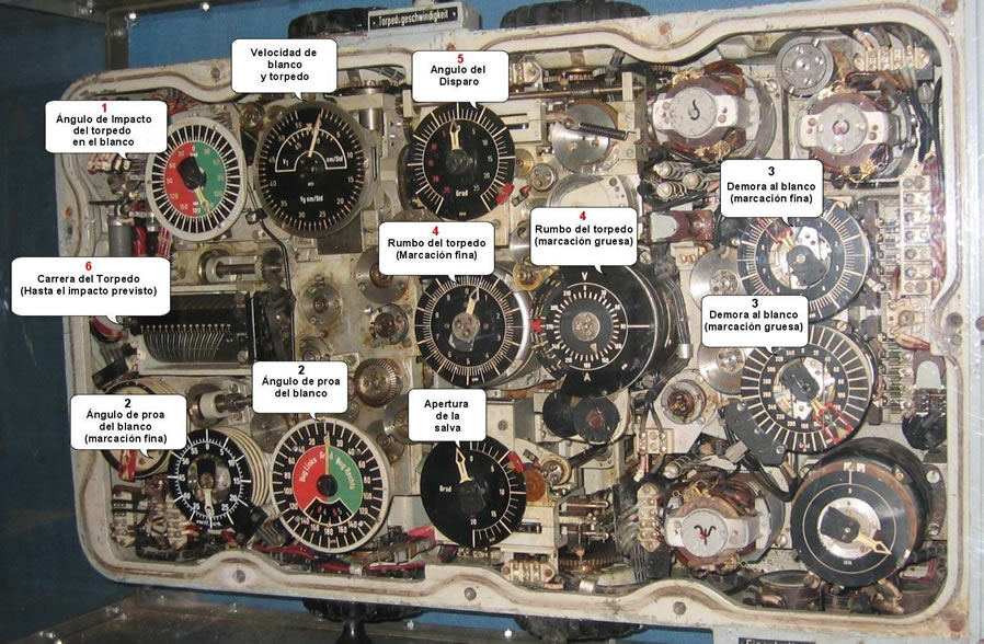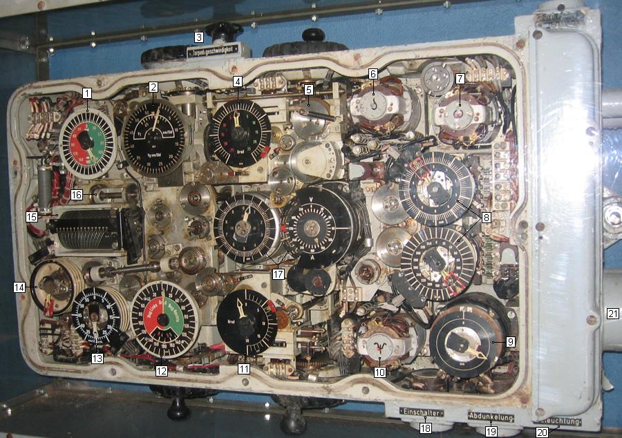 1.- Angulo de retardo (se regula para que el torpedo llegue al blanco en un punto de coincidencia), 2.- Velocidad del torpedo y del blanco, 3.- Regulador de la velocidad del torpedo (encima de la etiqueta se encuentra una manija que regula la velocidad del torpedo), 4.- Corrector del ángulo de paralaje (Corrección angular cuando se lanza con ángulo para que el torpedo alcance el blanco a la distancia establecida. Esto se debe a la diferencia de distancia entre el tubo de donde parte el torpedo y la óptica desde la que se obtiene la marcación, unos 35 metros mas atrás en la torre), 5.- Conmutador para datos y disparo de torpedos de proa o torpedo de popa, 6.- Dispositivo corrector del ángulo de paralaje (ver 4), 7.- Marcación al blanco (Ángulo lateral entre la proa del submarino y la marcación al blanco, se recibe del TZR correspondiente a uno de los periscopios o al UZO), 8.- Indicador de marcación al blanco (ver 7), 9.- Velocidad de giro (La velocidad del torpedo cuando gira para ponerse en el rumbo establecido, a mas velocidad mayor giro y mas necesidad de corrección), 10.- Dirección del disparo (Angulo del recorrido del torpedo), 11.- Angulo de dispersión (En las salvas), 12.- Angulo de proa del enemigo (Angulo entre la marcación visual al enemigo y la proa de éste), 13.- Rumbo propio, 14.-Regulación de la distancia de alcance (carrera máxima del torpedo), 15.- Distancia (Al blanco), 16.- Mando de disparo, remoto, 17.- Indicadores del curso de torpedos y dispersión de la salva, 18.- Einschalter > Interruptor o contactor general del TDC, 19.- Abddunkelung > Regulador de la intensidad de luz del TDC, 20.- Beleuchtung > Interruptor de iluminación del TDC, 21.- Conmutador azul (ver plano). |