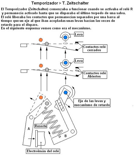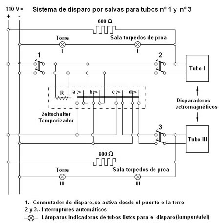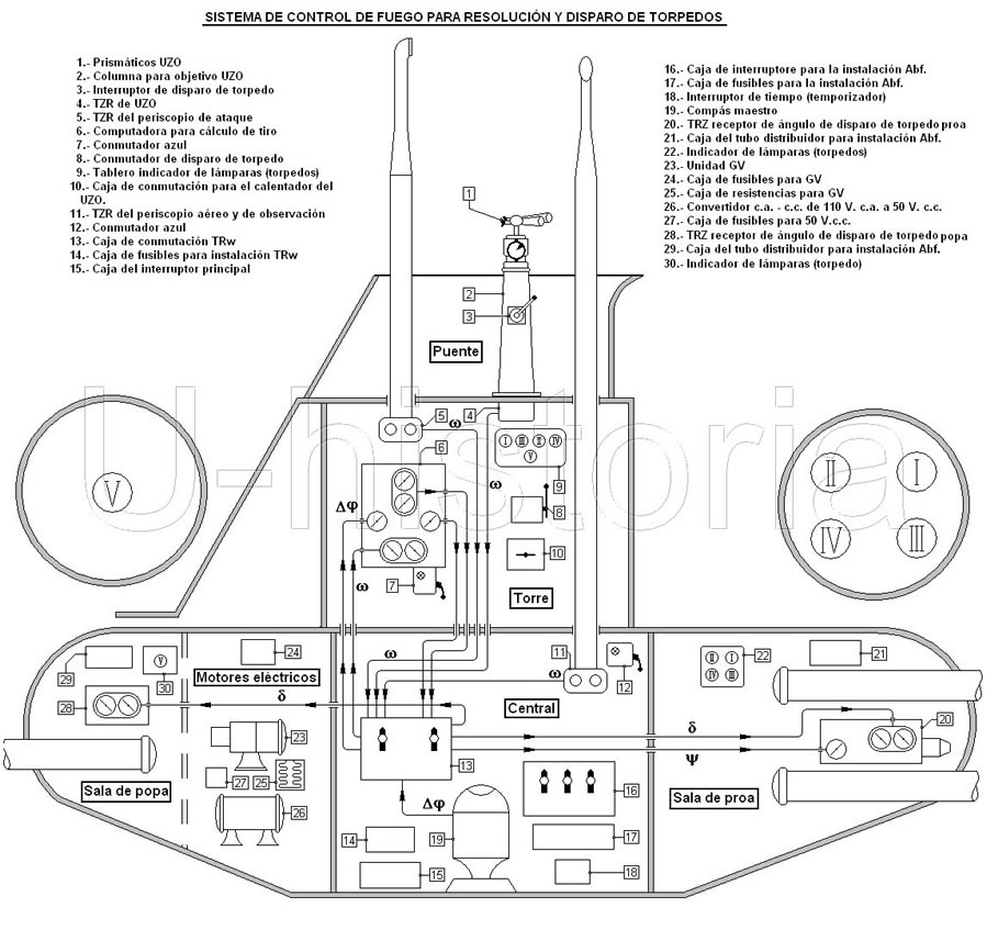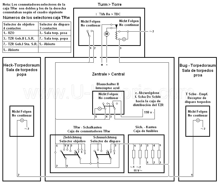 correspondiente o al UZO Marcas 5, 4 y 11 y líneas v (ver la foto del TZR del periscopio de observación) y desde allí y al tiempo que los datos de rumbo propio tomados desde el compás maestro Marca 19 y líneas Dj era enviado automáticamente a la caja de conmutación TRW (Torpedorichtungsweiseranlage) > Instalación de la computadora para dirección de disparo del torpedo, marcada 13 en el plano desde donde salían los datos hacia la computadora para cálculo de tiro (TDC) marcada 6 donde una vez procesados los datos regresaban de nuevo a la caja de conmutación TRw de donde salían hacia los receptores de ángulo de disparo de torpedo TRZ marcas 20 y 28 situados en las salas de torpedos por las líneas d y. Una vez regulada la trayectoria del torpedo o torpedos a disparar, según los datos presentados, éstos podían ser disparados desde el puente, la torre o la central, marcas 3, 8 y posiblemente las 7 y 12. Los tubos lanzatorpedos también iban provistos de una palanca de disparo para el hipotético caso de que fallara la línea de disparo desde los lugares citados. La instalación era alimentada por un convertidor de 110 V c.c. a 50 V c.a, marca 26 situado en la sala de motores eléctricos. Las marcas 16, 17, 21 y 29 están relacionadas con los interruptores de disparo de torpedo (Abf. = Abfeuerschalter) y todas ellas son cajas que contienen diferentes sistemas de instalación y protección. Las marcas 23, 24 y 25 corresponden a la Unidad GV y a instalaciones de esa unidad sobre cuya función no he encontrado información y que es posible que se tratara de un sistema de alimentación alternativo al convertidor. Las marcas 9, 22 y 30 eran cuadros de lámparas que indicaban algo relacionado con cada uno de los tubos (los supuestos de encendido de una o varias lámparas son: carga, descarga, tubo que se va a disparar u orden de disparar el tubo correspondiente). |
