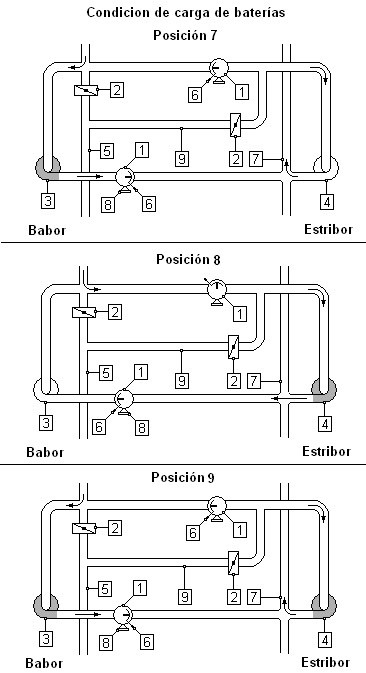 Nota: El presente esquema y la circulación de aire corresponde con la circulación del mismo para el caso de navegación en superficie, con uno de los dos ventiladores o con ambos. Para conocer la circulación de aire y posición de las válvulas en otros casos (navegación en inmersión o condiciones de carga de baterías) consultar los esquemas adjuntos |