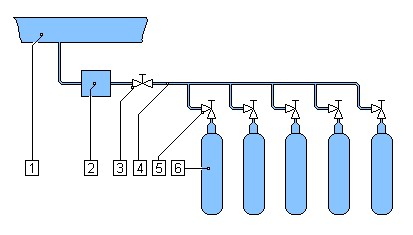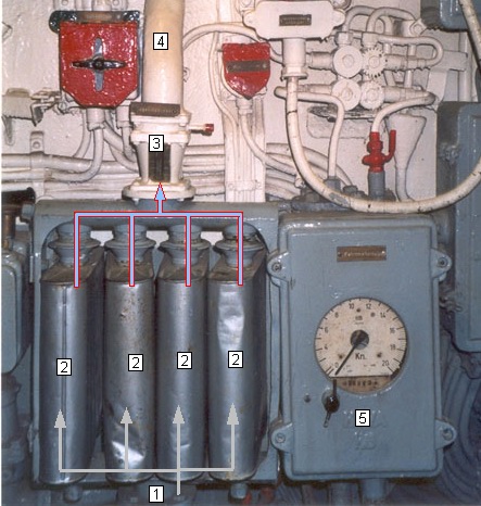 El circuito de oxigeno se usa durante la inmersión, y si es necesario, para purificar el aire. El oxigeno se almacena en botellas distribuidas en diferentes compartimentos y cuando los niveles de oxigeno del aire, que hay dentro del submarino descienden, se introduce en los troncos de ventilación para mantener esos niveles dentro de un límite que esta establecido entre un 15 y un 20%. El oxigeno se cargaba bien en botellas o bien en cartuchos (estos por medio de una combinación química. Las botellas contenían en torno a 50 litros de oxigeno cada una y a una presión de entre 150 y 200 atmósferas iban conectadas a un colector, el oxigeno se introducía en las dosis precisas en el tronco de ventilación para ello tenia (como se ve en el dibujo) un aparato o sistema de dosificación, el sistema de oxigenar con cartuchos se llevaba a cabo colocando esos cartuchos en un contenedor o aparato situado en la central el oxigeno se gaseaba libremente. |