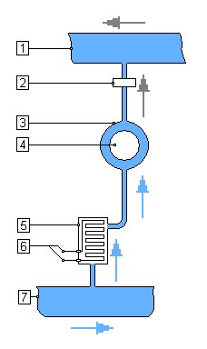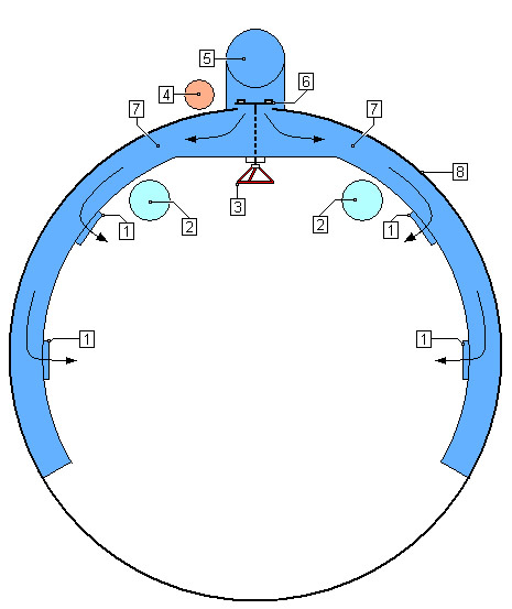 El circuito de la figura muestra la circulación de aire con dos ventiladores cuando el submarino va sumergido y con renovación de aire pos medio de cartuchos (para otros casos con un ventilador y sumergido ver los esquemas de circulación sumergido) |