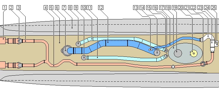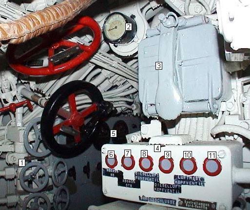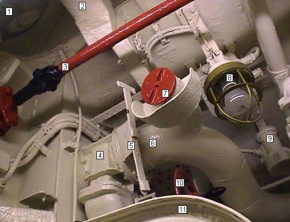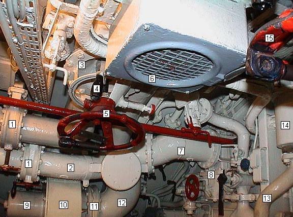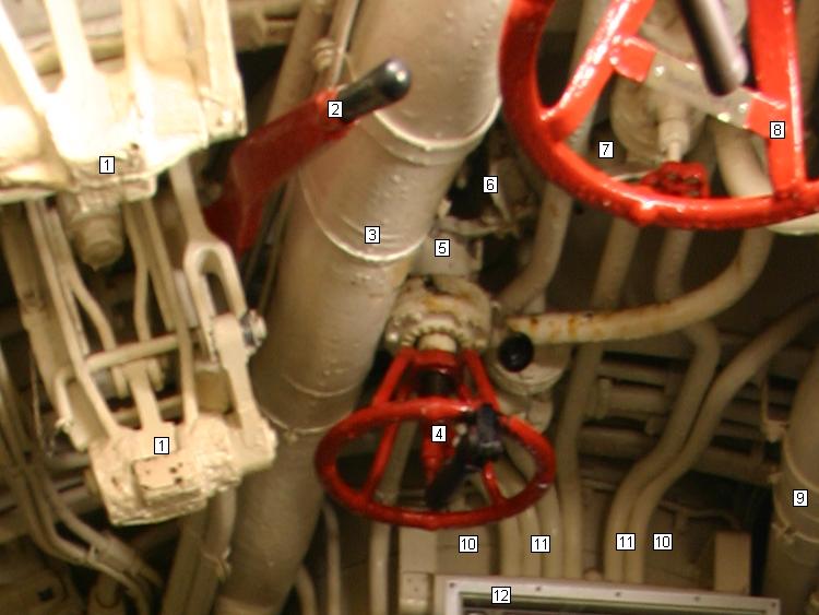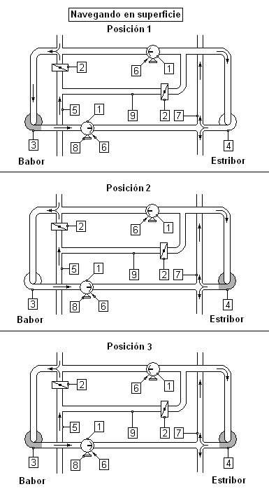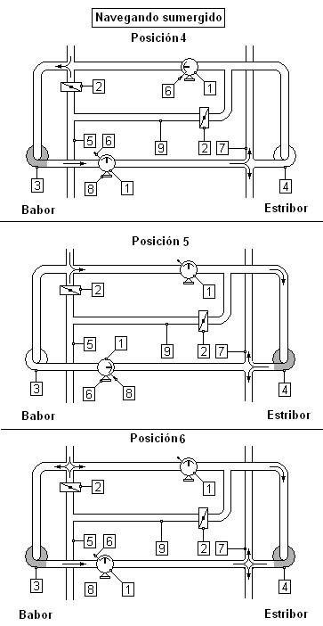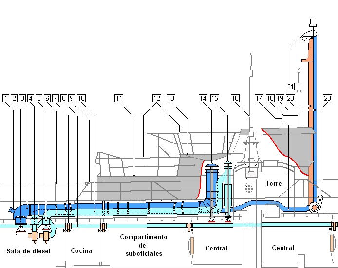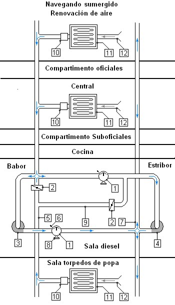 1.- Silencioso del escape del motor de babor, (estribor simétrico) 2.- Válvula de escape del motor de babor, (estribor simétrico) 3.- Tubo de escape hacia el snorkel del motor de babor babor, (estribor simétrico) 4.- Colector de escape de ambos motores hacia el snorkel, 5.- Cubierta sobre el casco resistente, 6.- Válvula de pie para ventilación de los motores diesel, 7.- Casco, 8.- Válvula de pie de entrada/salida aire de ventilación de babor, 9.- Válvula de pie de entrada/salida aire de ventilación de estribor, |