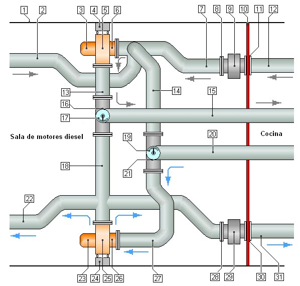 1.- Casco resistente, 2.- Tronco principal de extracción de aire en babor y desde popa, 3.- Motor eléctrico del ventilador de babor, 4.- Soporte y silentblocks (amortiguadores de vibraciones y ruido) del ventilador de babor, 5.- Ventilador de babor, 6.- Aspiración del ventilador de babor, 7.- Tronco principal de extracción de aire en babor y desde proa en la sala diesel, 8.- Acoplamientos de los tubos (las figuras iguales también lo son), 9.- Válvula de compuerta entre mamparos de babor (ver), 10.- Mamparo entre cocina y sala de motores diesel, 11.- Acoplamiento al mamparo, 12.- Tronco principal de extracción de aire en babor desde proa en la cocina, 13.- Tubo de conexión entre la válvula de pie de babor y el ventilador de babor, 14.- Tubo de conexión entre la válvula de pie de estribor y el ventilador de babor 15.- Tronco de ventilación que conecta la válvula de pie de babor con el mástil de extracción en babor, 16.- Válvula de pie de babor, 17.- Valvula desviadora de babor (está montada dentro de la válvula de pie y puede tener 3 posiciones diferentes dependiendo de hacia donde queramos dirigir el aire y desde cual de los ventiladores), 18.- Tubo de conexión entre la válvula de pie de babor y el ventilador de estribor, 19.- Válvula desviadora de estribor (está montada dentro de la válvula de pie y puede tener 3 posiciones diferentes dependiendo de hacia donde queramos dirigir el aire y desde cual de los ventiladores), 20.- Tronco de ventilación que conecta la válvula de pie de estribor con el mástil de entrada de aire, 21.- Válvula de pie de estribor, 22.- Tronco de ventilación hacia popa, 23.- Motor eléctrico del ventilador de estribor, 24.- Soporte y silentblocks (amortiguadores de vibraciones y ruido) del ventilador de estribor, 25.- Ventilador de estribor, 26.- Aspiración del ventilador de estribor, 27.- Tubo de conexión entre es ventilador de estribor y la válvula de pié de estribor, 28.- Acoplamiento, 29.- Válvula de compuerta entre mamparos de estribor (ver), 30.- Acoplamiento al mamparo, 31.- Tronco de ventilación hacia proa. |