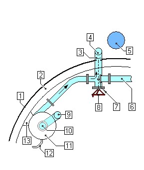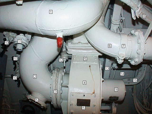 1.- Tubo principal de ventilación hacia proa, 2.- Tubo de aspiración del ventilador de estribor, 3.- Acoplamiento flexible para amortiguar las vibraciones, 4.- Carcasa del ventilador de estribor, 5.- Registros para pequeñas reparaciones o limpieza, 6.- Tubo principal de ventilación hacia popa, 7.- Abrazadera de soporte de tubo, 8.- Cables eléctricos, 9.- Motor eléctrico del ventilador, 10.- Válvulas de control de nivel de combustible, 11.- Portalámparas, 12.- Tacos de goma que actúan como amortiguadores de las vibraciones del ventilador, 13.- Cuaderna, 14.- Casco resistente o de presión, 15.- Líneas de suministro eléctrico al motor del ventilador |