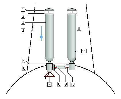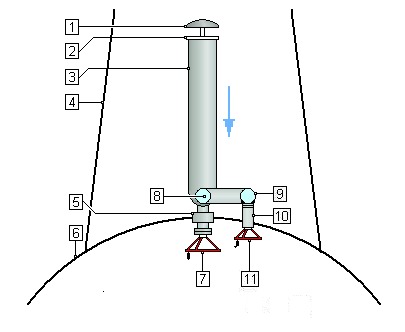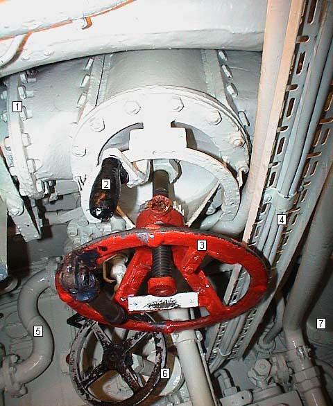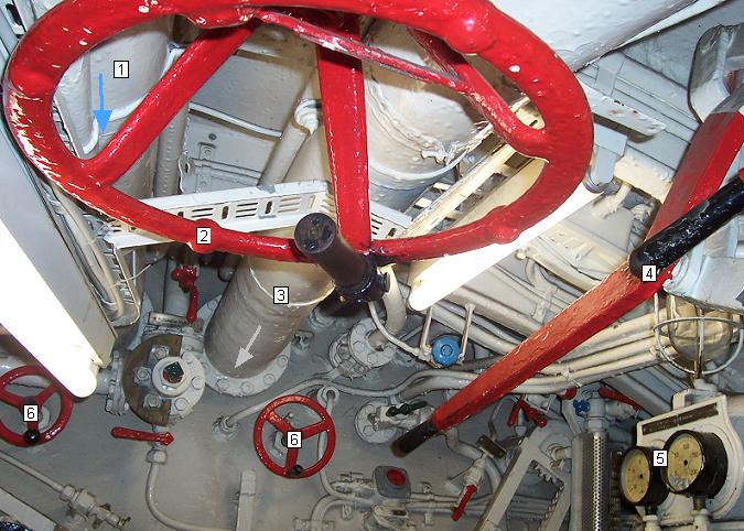 El mástil comunica con la válvula de pie a través del tronco exterior de ventilación (ver plano parcial de ventilación alzado y ventilaciones exterior). Cuando el submarino se sumerge se cierra la válvula de cabeza (1) por medio del volante correspondiente situado en la sala de control o central y la de pie situada en la sala diesel. |
