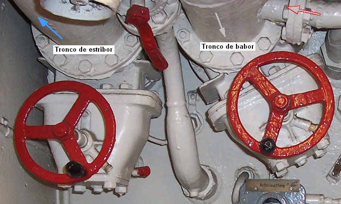 Las flechas de la foto indican la dirección del flujo de aire, como ya se ha visto el tronco de babor aspira el aire de los compartimento mientras que el flujo de estribor envia aire renovado a los mismos. A la derecha vemos una flecha bordeada en rojo es la aspiración de aire de un compartimento de estribor, posiblemente del compartimento del conmutador de baterías |