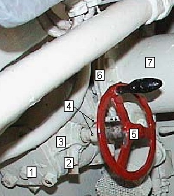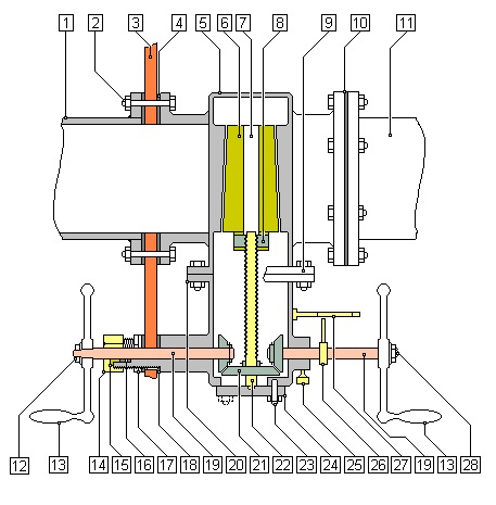 1.- Pared del tubo de ventilación, 2.- Tuerca y espiga o tornillo del acoplamiento, 3.-Mamparo entre compartimentos, 4.- Juntas o frisas de los acoplamientos, 5.- Cuerpo de la válvula, 6.- Válvula, 7.- Alojamiento para el paso del husillo, 8.- Tuerca del husillo que se desplaza con la válvula hacia arriba o abajo, 9.- Acoplamiento del puente de la válvula, 10.- Acoplamiento y junta de la válvula al tronco principal de ventilación, 11.- Tubo o tronco de ventilación, 12.- Tuerca del volante, 13.- Manillas de los volantes y volantes, 14.- Tuerca del prensaestopas, 15.- Prensaestopas, 16.- Empaquetadura ensebada (estopa), 17.- Tuercas arandelas y junta para hacer estanco el paso del conjunto del volante, 18.- Junta estanca, 19.- Ejes de volantes y engranajes, 20.- Acoplamiento del puente de la válvula, 21.- Conjunto de coronas de engranajes, 22.- Husillo de la válvula, 23.- Espiga de la tapa de registro, 24.- Tapa de registro para desmontaje de mecanismos, 25.- Engrasador para husillos ejes y engranajes, 26.- Indicador móvil de estado de la válvula (se desplaza al girar el volante), 27.- Varilla indicadora fija del estado de la válvula (marca derecha abierta / marca izquierda cerrada) 28.- Arandela tuerca y espiga roscada del volante. Esta válvula (ver foto de válvula de compuerta) tiene por objeto cerrar el paso en caso de inundaciones en el compartimento correspondiente para evitar que la inundación y a través de las rosetas de ventilación se extienda hacia otros compartimentos también puede ser utilizada en caso de averías del circuito de ventilación o por otras causas (posibilidad de gases tóxicos en el circuito) si es necesario. |