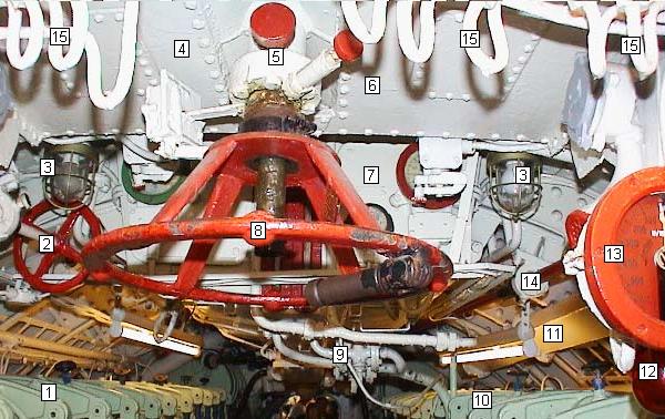 1.- Registro para limpieza de la válvula del tronco de ventilación, 2.- Válvula de pie para ventilación de motores diesel (ver sección A), 3.- Tronco de ventilación de los motores diesel, 4.- Válvula de pie de estribor para ventilación de compartimentos (ver sección B), 5.- Válvula de pie de babor para ventilación de compartimentos (simétrico a sección B), 6.- Barandilla y candeleros desmontables y/o abatibles, 7.- Válvula de compuerta entre mamparos (ver esquema de dicha válvula), 8.- Troncos de ventilación situados a lo largo del submarino y dentro del casco resistente (ver foto de mamparo suboficiales a sala central, marcas 7), 9.- Batayola (barandilla) fija, 10.- Tronco de ventilación de estribor situado fuera del casco resistente, 11.- Cubierta "Wintergarten" del cañón de 37 mm. en montaje simple, 12.- Batayolas de los "winterganten",13.- Cubierta "Wintergarten" de los cuatro cañones de 20mm. en montajes dobles, 14.- Mástil y válvula de cabeza para aspiración de aire de ventilación de los motores diesel (ver sección C), 15.- Mástil y válvula de cabeza para aspiración de aire de ventilación para compartimentos ( ver sección D), 16.- Periscopio de ataque, 17.- Tubo injertado al tronco de ventilación de los motores diesel para aspiración de aire desde el snorkel cuando el submarino navega sumergido, 18.- Periscopio de observación, 19.- tronco de aspiración del snorkel, 20.- Tronco de descarga de gases de exhaustación o escape de los motores diesel, 21.-Flotador de la válvula de cierre del snorkel que evita la entrada de agua en el tronco de ventilación |